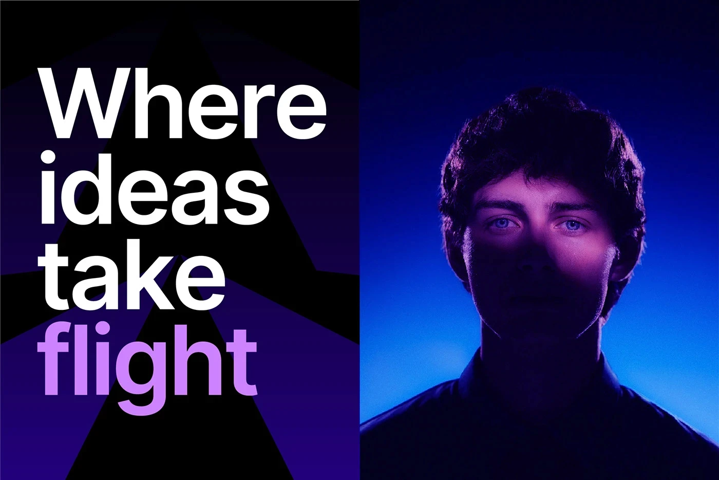 The two angular arrows represent momentum and collaboration pushing ideas forward and connecting innovators to opportunities. The gradient purple to blue palette conveys creativity, trust, and technological innovation.